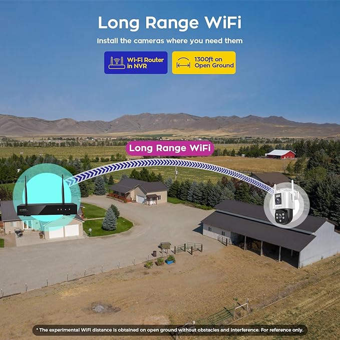- 【Long Range WiFi 6 for Easy Installation】Evolved to latest WiFi 6 technology, on open ground the XMARTO WiFi cameras can be installed up to 1300ft (400m) away from the NVR. In actual houses with walls & interferences, you can still mount the cameras a few hundred feet away. This makes it possible to use the cameras wirelessly