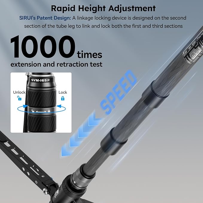 - Lightweight & Compact Carbon Fiber Monopod: SVM-165 monopod with 36mm max tube, weighs only 3.4lbs/1.52kg and load up to 22lbs/ 10kg, which is ideal for active shooting where you can move it easily to capture images at the appropriate angle.