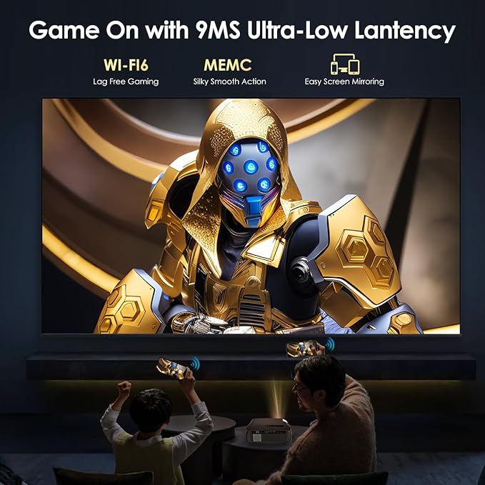 - [ Ultimate Gaming Projector: Low Latency & Wi-Fi6 ] Dominate the competition! Experience ultra-smooth gameplay thanks to HDMI 2.1, Wi-Fi 6, RJ45 Ethernet, and 60Hz high refresh rate for incredibly low input lag. Plus, innovative NFC allows instant phone-to-projector screen mirroring/casting with a tap.