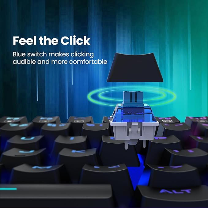 - 【Mechanical Keyboard: Precision Blue Switches】Designed for competitive gamers, this full-size mechanical keyboard features authentic clicky blue switches delivering crisp tactile feedback with 4mm key travel. N-key rollover and anti-ghosting technology ensure flawless performance in FPS/MOBA games, while the ergonomic stepped keycap design minimizes wrist strain during extended sessions.
