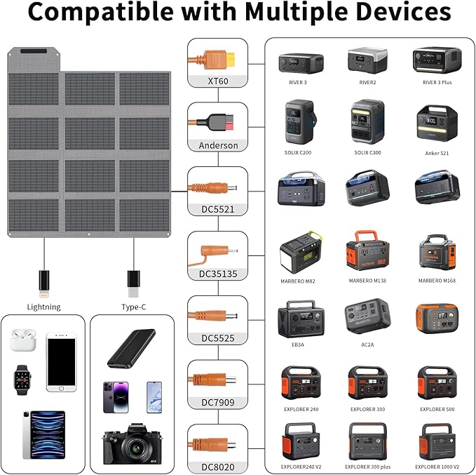 - 【Wide Compatibility】With 7 in 1 solar connector (XT60,Anderson,DC5521 DC15135,DC5525,DC7907,DC8020), the 120W solar panel for power stations is compatible with the majority of portable power stations and solar generators that exist on the market