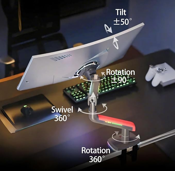 - 4.【Ergonomics Comfort】Reduce discomfort from long time gaming or work through new ERGONOMIC design; Freely adjust with 360° rotation, -50° to +50° tilt, -90° to +90° swivel, and up to 25 inches long arm extension.