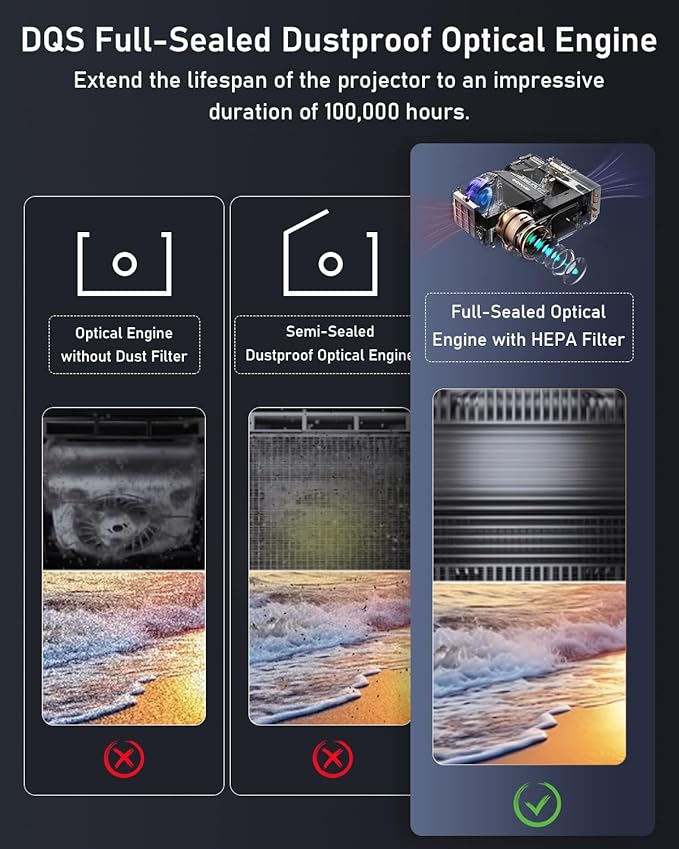 - [Innovative Upgrades for Longevity] The dustproof projector is equipped with an upgraded DQS full sealed optical system and a HEPA air purification filter to prevent dust from affecting image quality, ensuring a long lifespan of up to 100,000 hours. Its durable design enhances your home entertainment experience, providing unparalleled movie enjoyment for years to come. The upgraded super-quiet cooling fan improves heat dissipation by 38% and reduces noise by over 60%, achieving a noise level below 25 decibels.