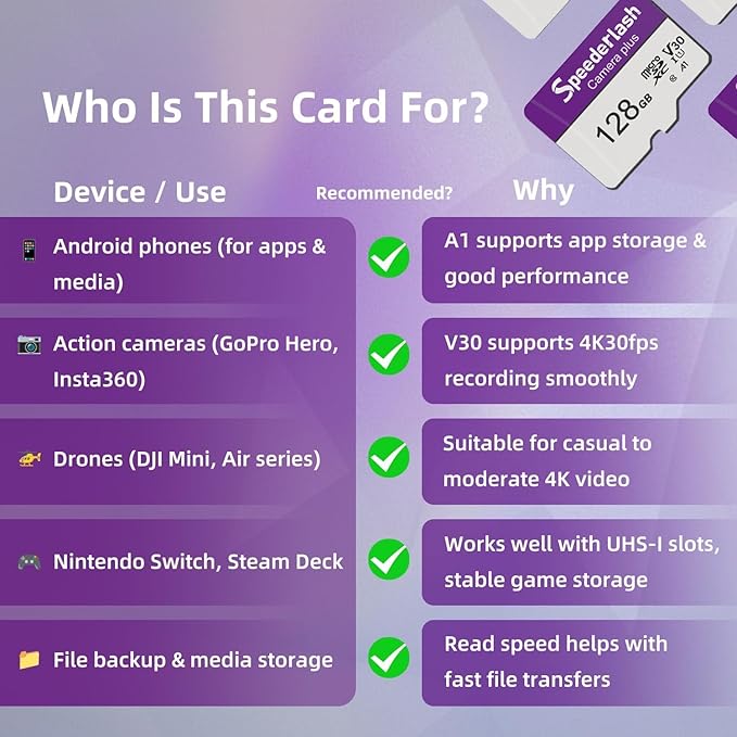 - Works with Everything You Own: Phones, tablets, drones, dash cams—this card is built to handle them all. Plug-and-play with UHS-I compatibility, it's a one-card solution for work, travel, gaming, and more. The SD logo is a trademark of SD-3 C, LLC.