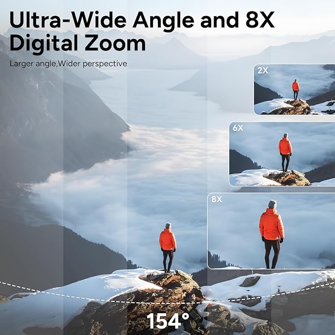 - Unleash Your Creativity: 154° Ultra-Wide Angle & 8x Zoom. Seamlessly switch between capturing expansive scenes and isolating intricate details. The wide field of view and zoom range also allow for nuanced control over depth of field, adding a professional touch to your shots.