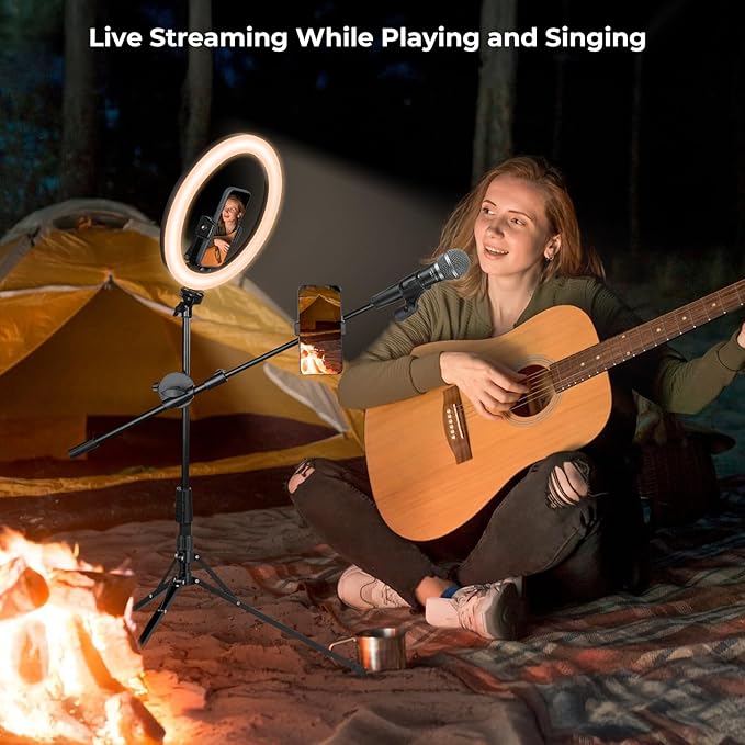 - 【Dual Function Ring Light and Microphone Stand】 Designed for multi-tasking, this light ring includes two phone holders—one on the main light and one on the adjustable arm—both rotatable for vertical or horizontal use. A microphone mount is also included, letting you record voice and video together. Whether live streaming, teaching, or filming voiceovers, this ring light with phone holder makes your setup smooth and efficient.