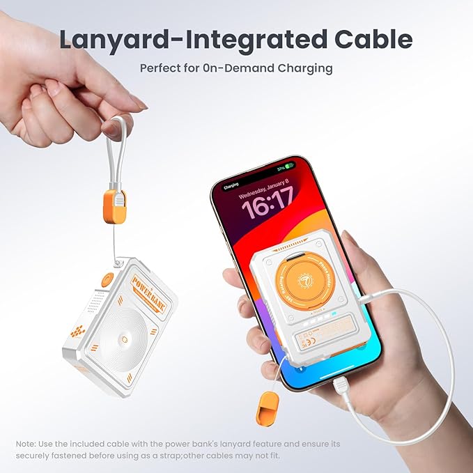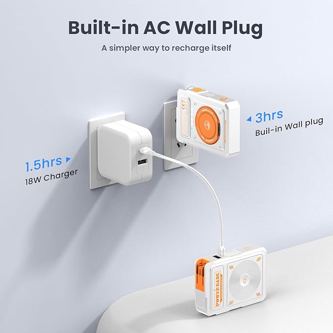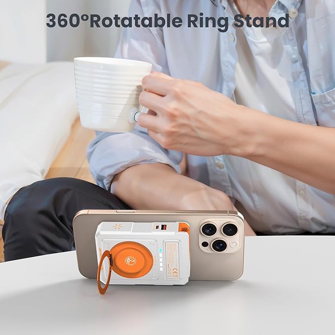 - 【Built in Foldable AC Plug&Lanyard&Stand】The magnetic power bank with built in foldable AC plug,Power bank only needs 4 hours full recharge by AC wall plug.In addition,the magnetic portable charger also comes with a versatile USB C to USB C cable that can be used to charge your phone or as a lanyard.It also has a 360° rotating stand,perfect for video calls or watching videos.Thoughtful design and mighty performance are tailor-made to meet the demands of a modern,mobile lifestyle;
