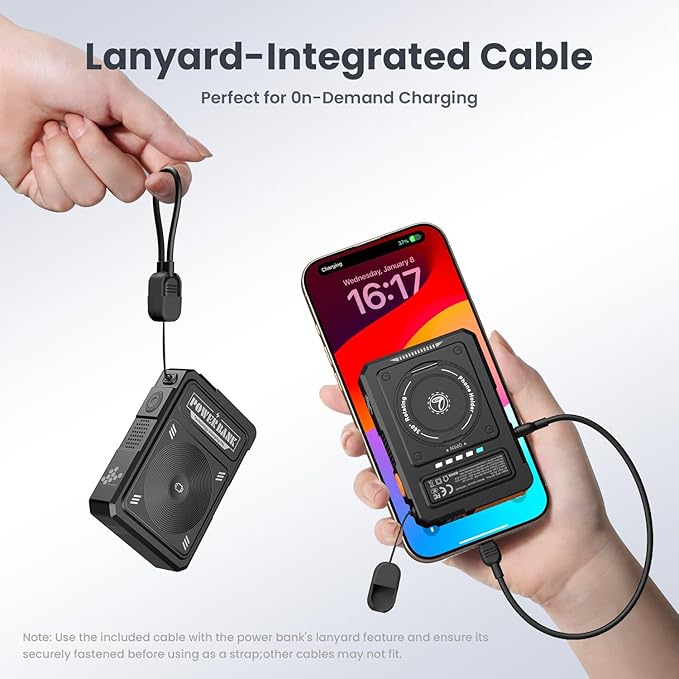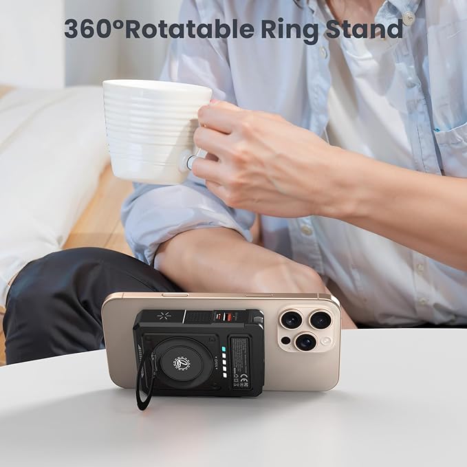 - 【Built in Foldable AC Plug&Lanyard&Stand】The magnetic power bank with built in foldable AC plug,Power bank only needs 4 hours full recharge by AC wall plug.In addition,the magnetic portable charger also comes with a versatile USB C to USB C cable that can be used to charge your phone or as a lanyard.It also has a 360° rotating stand,perfect for video calls or watching videos.Thoughtful design and mighty performance are tailor-made to meet the demands of a modern,mobile lifestyle;
