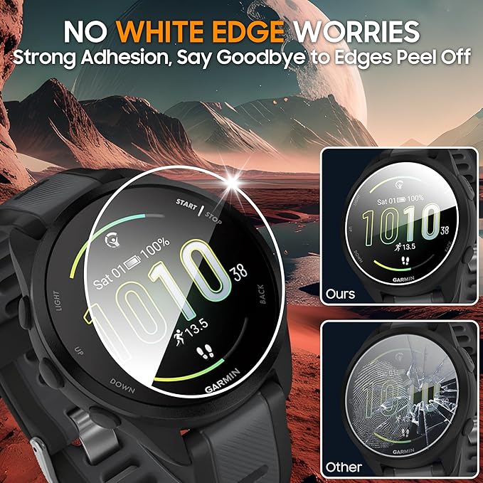 - Precise fit: This screen protector is designed to perfectly fit for Garmin Forerunner 165. With its precise cut and ultra-thin design, this screen protector seamlessly blends with the fashionable aesthetics of a smartwatch, providing full coverage and ensuring bubble free installation. Oil repellent coating can repel fingerprints and oil stains