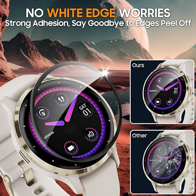 - Precise fit: This screen protector is designed to perfectly fit for Garmin Venu 3S. With its precise cut and ultra-thin design, this screen protector seamlessly blends with the fashionable aesthetics of a smartwatch, providing full coverage and ensuring bubble free installation. Oil repellent coating can repel fingerprints and oil stains