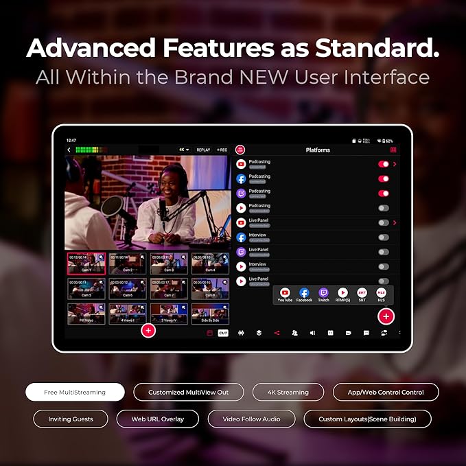 - 8 HDMI Inputs with 2 Assignable Outputs: Connect up to 8 HDMI sources with built-in 4K60 scaling for a seamless multi-camera setup. Assign your outputs (Program, Multiview, or Preview) independently via 2 HDMI outputs in stunning 4K
