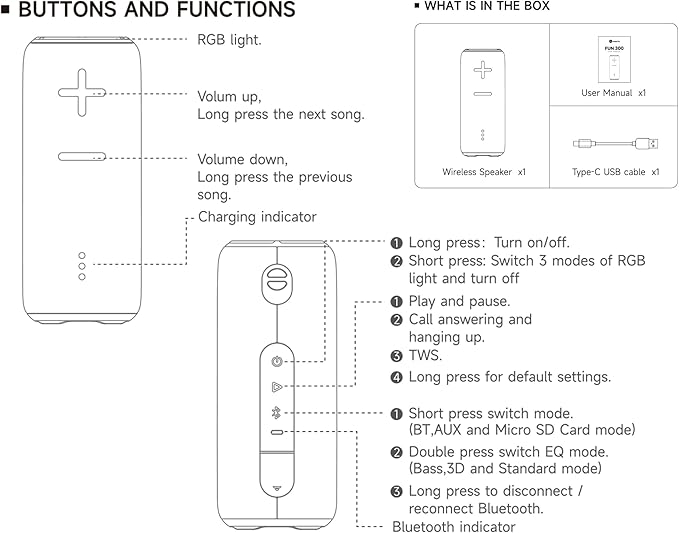 - 3 EQ Modes + UP to 8H Playtime at 60% volume for Nonstop Entertainment : Switch between Standard, 3D Surround, and Bass Boost modes to optimize sound for open-road motorcycle rides, poolside floating, or home parties. The up to 8+ hour battery keeps the music going all day, whether you're camping, biking, or relaxing by the water