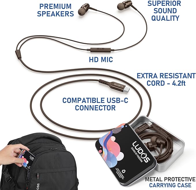 LUDOS OMNITONE USB C Headphones for iPhone 16 15 Pro Max Plus iPad Pro, 5 Years Warranty, USB-C Earbuds for Samsung Galaxy S24 S23 Ultra S22 S21 S20 A55 A54 A53, USB Type C Earphones - Brown