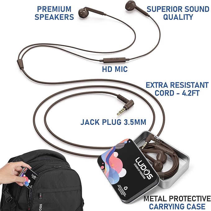 LUDOS FEROX Wired Earbuds in-Ear Headphones, 5 Year Warranty, Earphones with Microphone, Noise Isolation Corded for 3.5mm Jack Ear Buds for iPhone, Samsung, Laptop, Kids, School Students - Brown