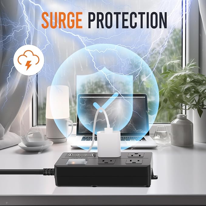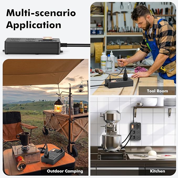 - 【8-in-1 Multi-Function Design】: Equipped with 4 wide-spaced AC outlets (1.8 inches apart), 2 USB-A ports, and 2 USB-C ports, this power strip can charge up to 8 devices simultaneously. Perfect for homes, offices, or outdoor activities. (Note: USB-C Not compatible with iPhone 15/16 original Type-C cables.)