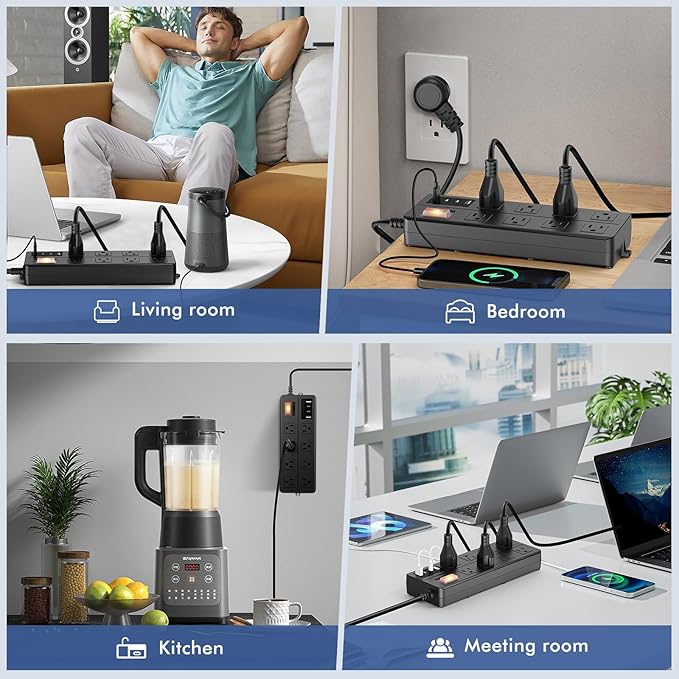 - 【12-in-1 Multi-Function Design】: Equipped with 8 wide-spaced AC outlets (1.8 inches apart), 2 USB-A ports, and 2 USB-C ports, this power strip can charge up to 12 devices simultaneously. Perfect for homes, offices, or outdoor activities. (Note: USB-C Not compatible with iPhone 15/16 original Type-C cables.)