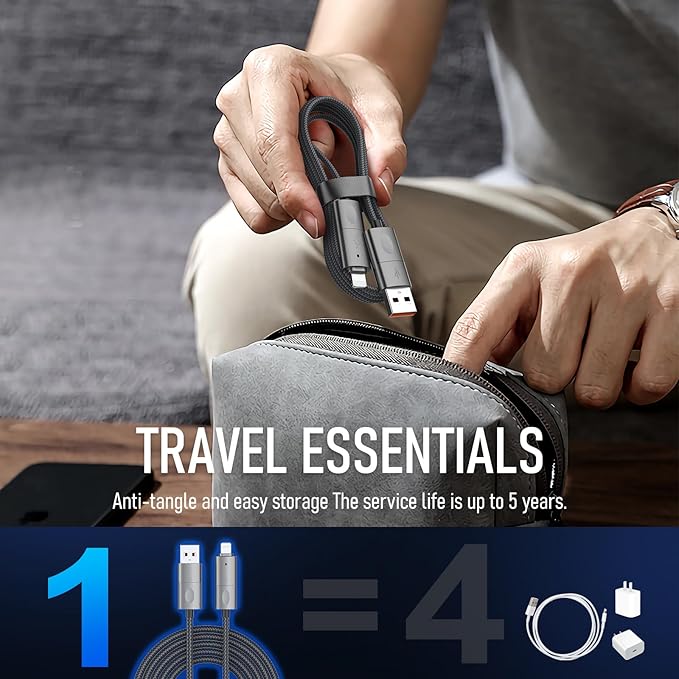 - 【240W FAST CHARGING & DATA SYNC】The 4-in-1 charging cable supports high-speed charging up to 240W when your devices use the USB-C to USB-C interface and a supported Type C charger.After testing, it can charge your iPhone 16/15 from 0% to 83% in just 30 minutes.Additionally,the data transfer speed for any combination of connectors is 480Mbps,meeting your daily needs.