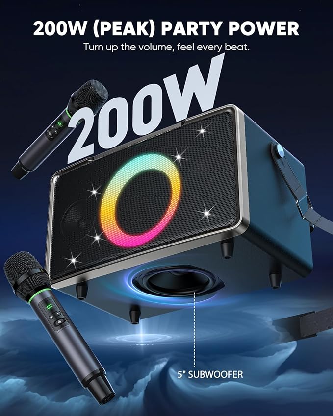 - 200W PEAK OUTPUT: GFEEN party bluetooth speaker delivers powerful 200W peak power and a 5-inch subwoofer, delivering an immersive and powerful bass experience for music enthusiasts of hip-hop, rock, classical, electronic, and beyond.
