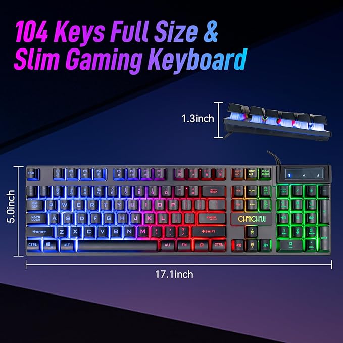 - Full-Size Gaming Keyboard Design: This gaming keyboard features 104 keys, including 25 anti-ghosting keys and 12 multimedia shortcuts. The 104-key full-size design provides precise, efficient typing and a simplified operating experience.