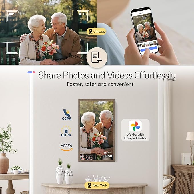 - 【Easy Setup and Impressive Functions】NexFoto digital photo frame is compatible with Google Photos. This wifi smart picture frame album can be synchronized with your Google Photos. Multifunctional custom settings, sush as caption, weather, calendar, clock and sleep mode, meeting your various needs. Extra large digital photo frame can be freestanding or wall mounted in both landscape and portrait with auto-rotation. User-friendly interface design makes it easy to use for people of all ages.