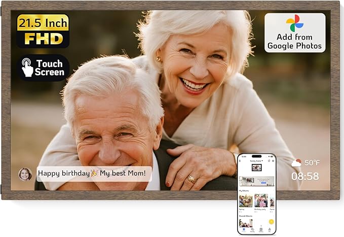 NexFoto Digital Photo Frame 21.5 Inch Touchscreen, 64GB Large Digital Picture Frame FHD 1920 * 1080, Add Photos from Google Photos, Upload Videos Instantly, for Housewarming, Dark Wood