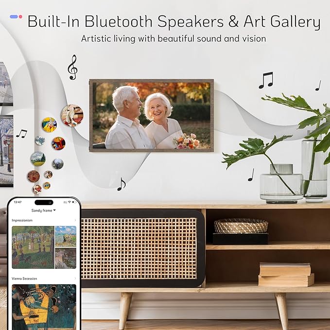 - 【Showcase Your Personal Gallery】NexFoto Wifi-enabled electronic picture frame (compatible with 2.4GHz and 5Ghz) brings your art collection and photo album to life on your wall. You can easily explore a diverse range of visual art, including masterpieces and NFT art. The minimalist modern design enhances your home decor, extra large digital photo frame can be freestanding or wall mounted, and its wall-mounted design featuring a swivel mount for easy rotation, providing a gallery-like viewing experience.