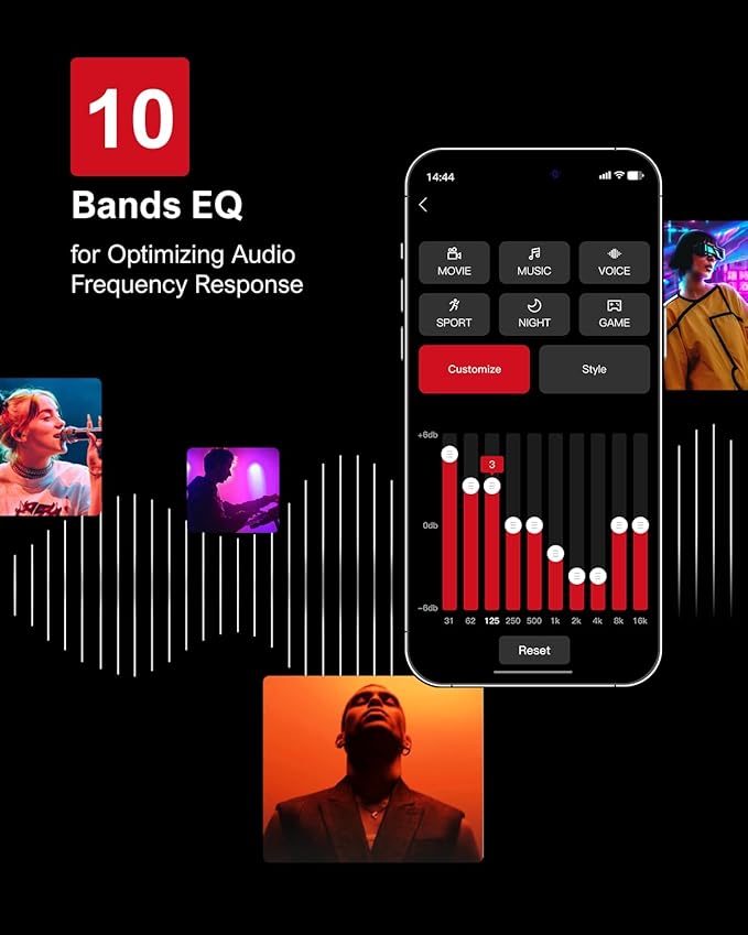 - 10-Band Equalizer Settings: Elevate your audio experience with 6 tailored EQ modes: Movie, Music, Voice, Sport, Game, and Night, each finely tuned for optimal performance. Further refine your listening with the Ultimea App's advanced "Customize", allowing you to dial in the perfect personalized sound to match your preferences and environment.