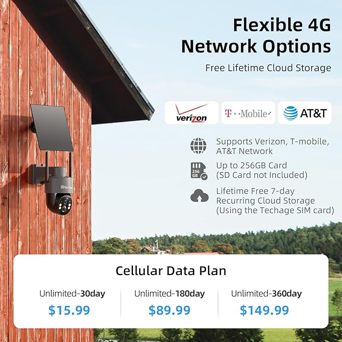 - Built-in SIM Card & Lifetime Free Cloud Storage – Our wireless security camera comes with a built-in 4G LTE SIM card and a 7 days free unlimited data package. The unlimited data plan can be renewed within the app, starting at $19.9 per month or $189.9 per year (other data plans are available). With our built-in SIM card, you get lifetime free 7-day loop cloud storage (8-second event recording) or the option to use the included 64GB SD card (supports up to 256GB). The SIM card supports AT&T, T-Mobile, and Verizon networks.