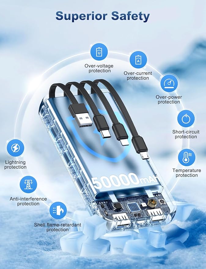 Portable Charger Power Bank 50000mAh Battery Pack, 22.5W Fast Charging PowerBank with Built in Cables,Travel Camping Essential USB-C Portable Phone Charger for iPhone Samsung Pixel Android iPad