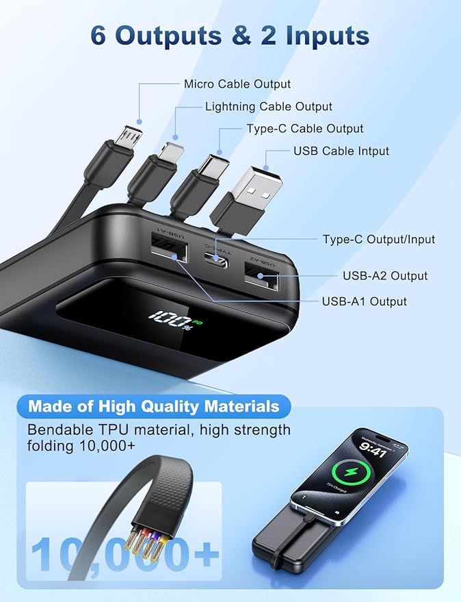 - Charge 6 Devices at Once: OHOVIV 50000mah Portable phone charger with 4 Built-in Cables(Lightning, Type-C, Micro, USB-A) and 3 Charging ports (2 USB-A , 1 Type-C), you can charge up to 6 devices at once without sacrificing power for Ultimate Convenience.These portable charger power bank cables made of high quality materials,withstanding over 10,000 bends.