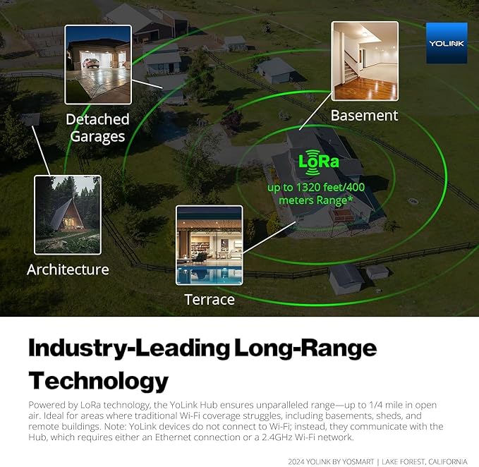 - Scalable IoT platform: one hub supports 300+ YoLink devices; part of a whole smart home/building ecosystem; hub options include standard Hub, SpeakerHub, and Cellular Hub.