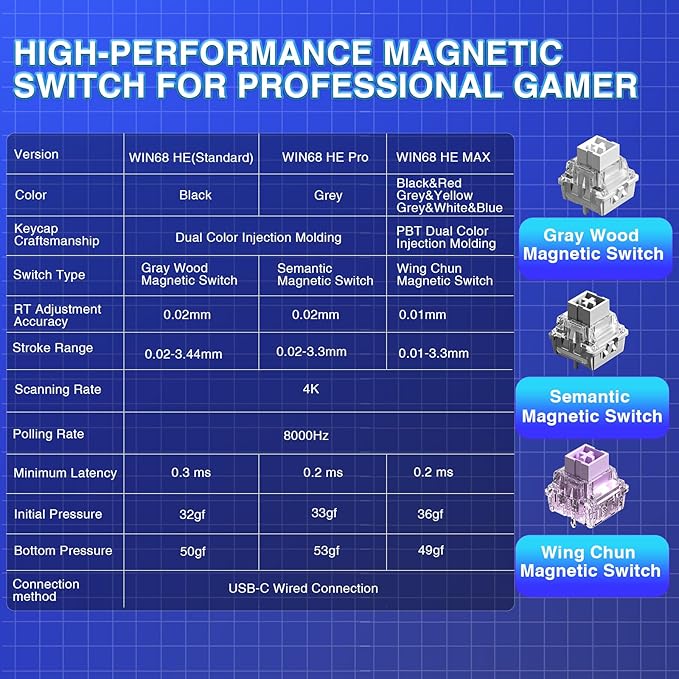 - Hall Effect Keyboard with Magnetic Switch: Equipped with advanced hall effect magnetic switches, the WIN68 HE gaming keyboard offers adjustable actuation point(0.02mm-3.3mm), and each key can be personalized to the smallest unit of 0.1 mm, providing an ultra-precise keying experience. In addition, press/reset sensitivity can be individually set via software to match the keystroke habits of different people in different types of games