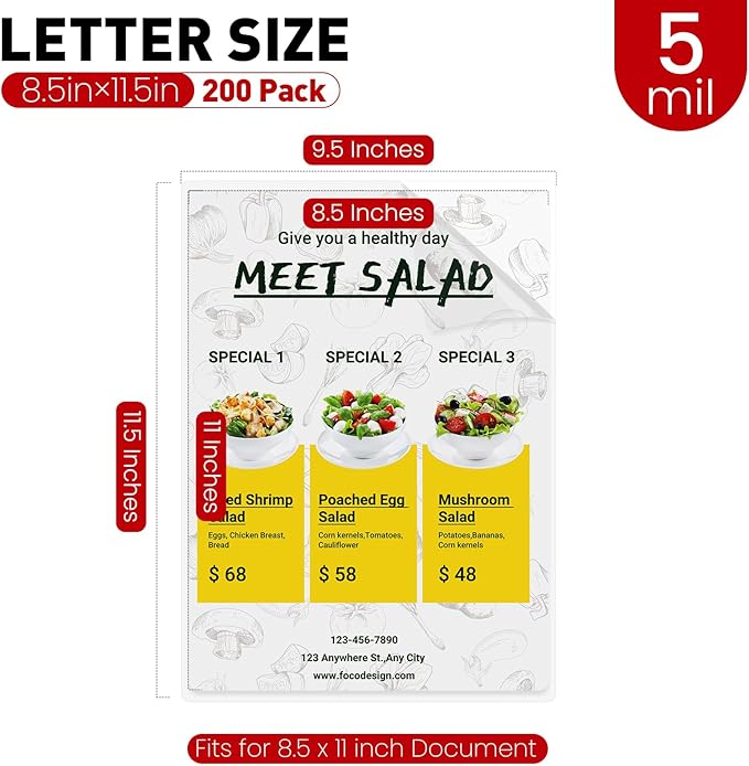 - Laminating Pouches Dimensions: 200PACK , 9" x 11.5", thickness: 5 Mil, fits for 8.5 x 11 inch document