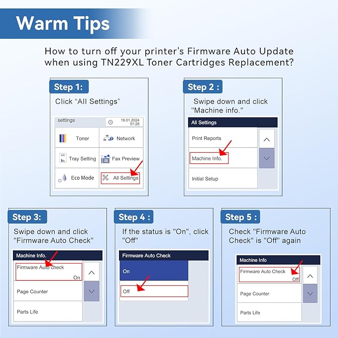 - With Chip: TN229XL TN-229XLBK/C/M/Y High Yield Toner Cartridges with built-in smart chip are engineered to ensure strong compatibility and accurate recognition. NO need to remove and install the OEM chip manually