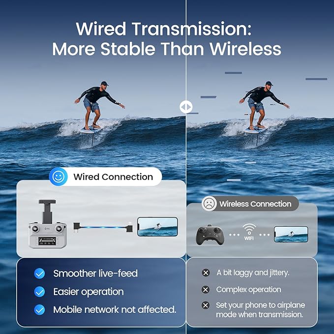 - 20,000FT Transmission with Low-Latency FPV: Unlike typical drones that rely solely on WiFi, the Holy Stone HS360D Drones with camera for adults 4K features a wired connection between the remote controller and your mobile device—dramatically reducing video latency. Enjoy smoother live-feed visuals, easier flight control, and uninterrupted 4K FPV transmission up to 20,000 feet (6KM)
