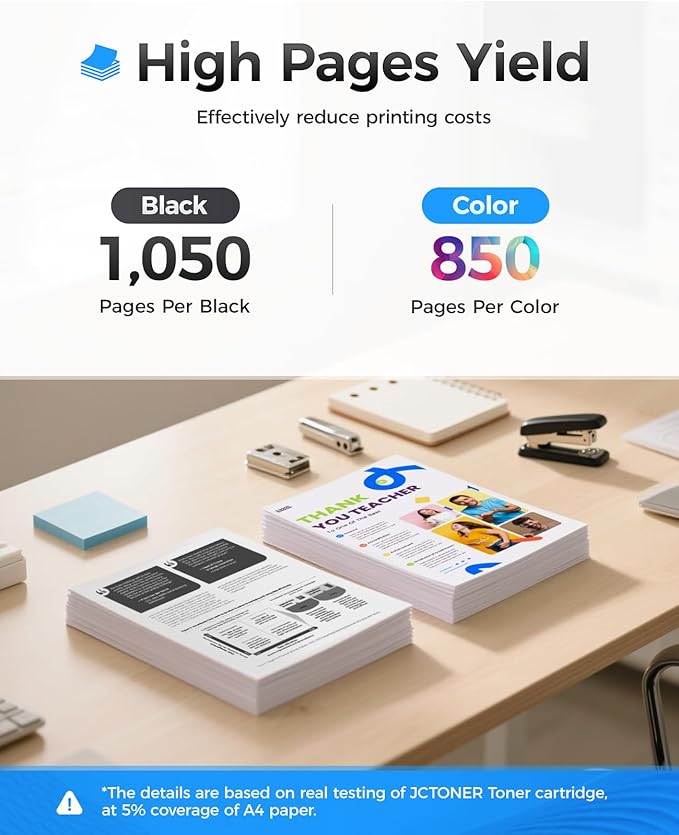 - The latest chip version: The JCTONER toner cartridges are equipped with the latest version of built-in chips, ensuring perfect compatibility between each toner cartridge and the printer. This enables you to print efficiently while maintaining stability and reliability, making installation convenient without the need for manual adjustments. All JCTONER toner cartridges have undergone strict quality testing and have obtained ISO9001 certification. High-quality toner cartridges can meet the demand for high printing volume. The fine toner ensures clear and stain-free printing results and extends the lifespan of the printer. You can purchase with confidence.