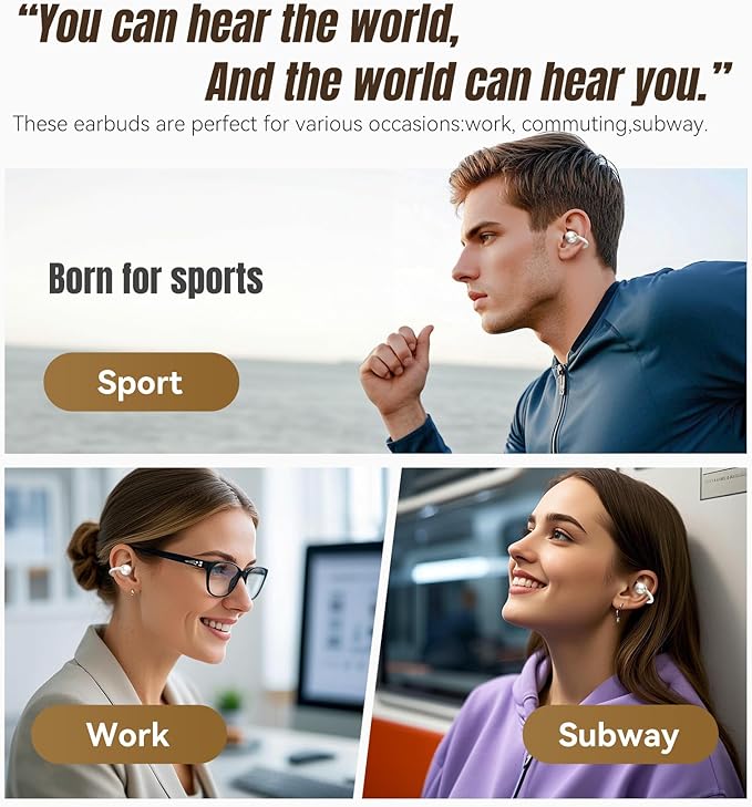 - Crystal Clear Calls with Advanced Noise Cancelling: Never miss a word with our state-of-the-art ENC noise cancelling technology. These wireless Bluetooth earbuds deliver crystal-clear calls even in windy environments. The dual sound wave directional transmission effectively eliminates sound leakage, making our open ear earbuds perfect for clear communication.