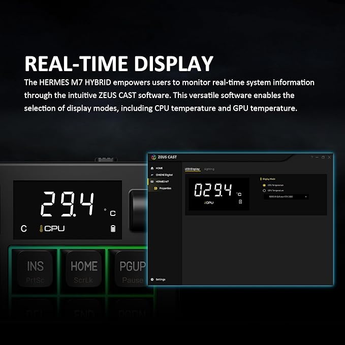 - Real-Time System Display: Comes with software control via ZEUS CAST, allowing users to monitor CPU and GPU temperatures in real time through the built-in digital display. Easily switch between display modes and optimize system visibility directly from the keyboard.