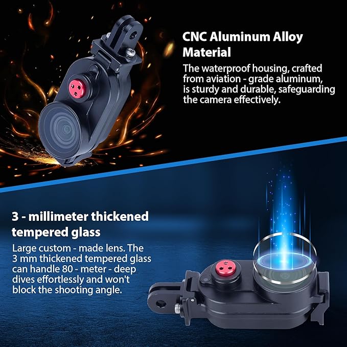 - 80M Deep Waterproof Performance: This aluminum waterproof case for Insta360 Go3 Go3s offers 80M deep waterproof protection. With innovative waterproof buttons, customized EPDM seals and 3mm thickened tempered glass, it ensures reliable underwater protection for Insta360 Go3 Go3s, preventing water seepage during deep diving