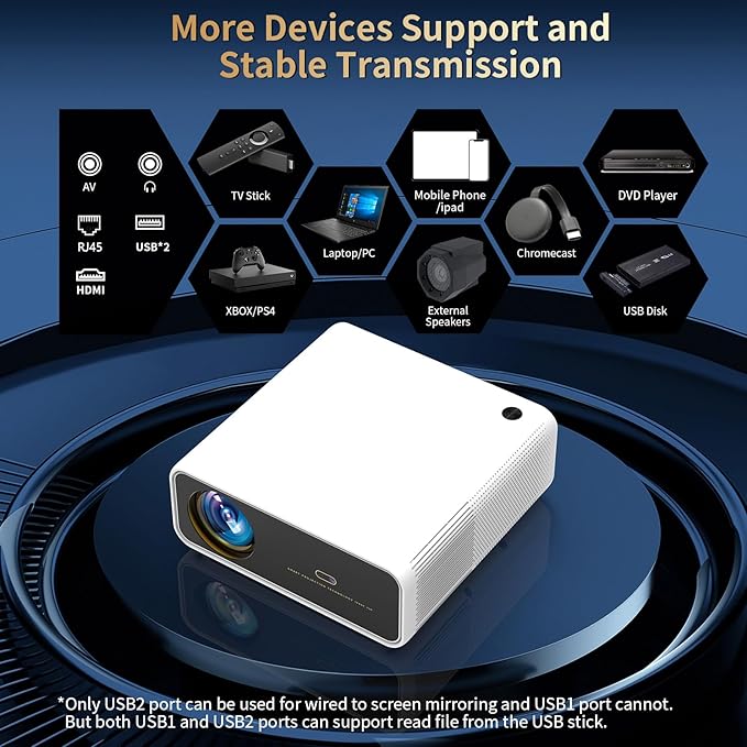 - 【Sealed Engine & Various Device Connections & Premium After-Sales】 Led video projector features a sealed optical engine and dual-fan cooling, superior in dust resistance and heat dissipation, extending its lifespan and preventing issues like black or yellow screens. Tv projector comes with HDMI port, two USB ports, and a 3.5 mm headphone jack, making it compatible with TV Stick, laptop, external speakers, iPhone, Android, iPad, Switch/PS5, and more. Ideal for indoor and outdoor movies, small meetings, outdoor camping, gaming, parties, learning, and business.We can offers attentive customer support and stands by the quality of their products giving you complete confidence.