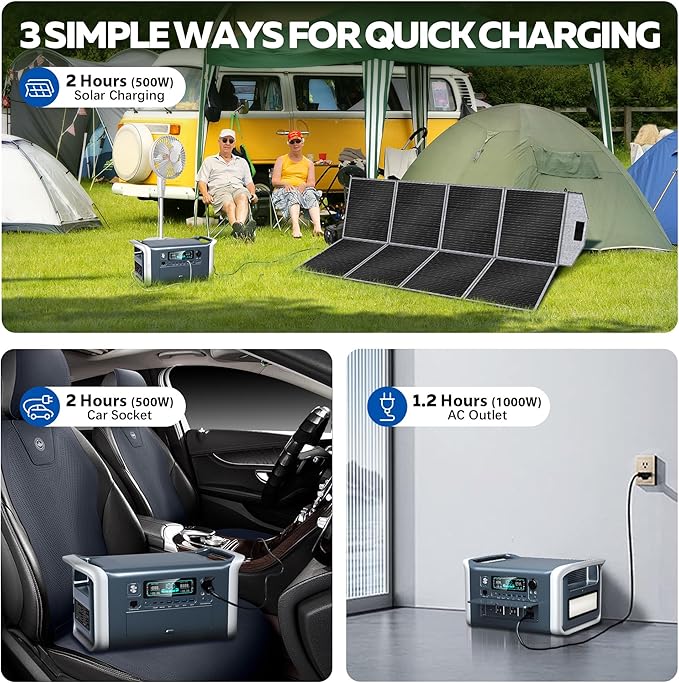 - [1.2 Hours Fast Charging]: With 1000W AC input, 90% recharge in 1 hours. Solar charging reaches 100% in 2 hrs at 500W XT60 input. You can also recharge your power station through the car outlet on a road trip. Always ready to go when you need it
