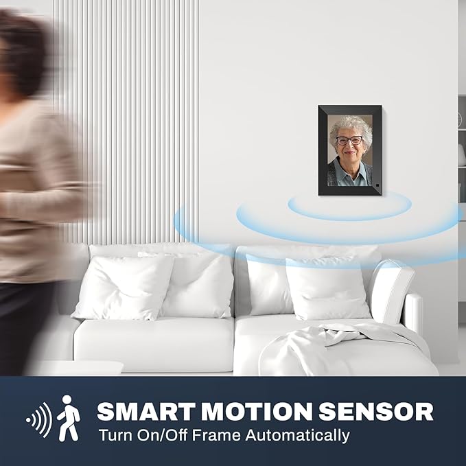 - Intelligent Body Sensing Technology:Equipped withadvanced automatic human sensor, this digital frames for photos can detectthe presence of people in its vicinity. When someone approaches, itautomatically turns on the screen, presenting your wonderful memories in aninstant. When no one is around, it will automatically enter standby mode to save power. This not only adds a touch of smart convenience to your daily lifebut also effectively extends the lifespan of the device.