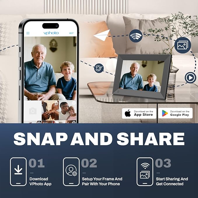 - 16GB Large Storage Space: You can share videos and photos to your frame securely and privately via VPhoto app and email from anywhere via WiFi, friends and family can enjoy your beautiful moments on the digital frame. The smart frame has 16GB of built-in memory to store up to 40,000 photos, and you can import and export images or videos. Supports Mirco SD card extended storage (up to 16GB, not included), giving massive storage capacity, you can store your fun times to your heart's content. Additionally, enjoy direct photo and video playback from USB flash drives and Mirco SD cards.
