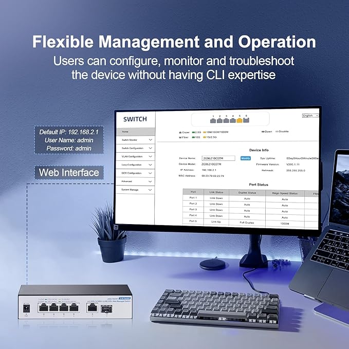 - 【Advanced Web Management】The Multi-gigabit managed switch supports device/port status query and various L2 configurations, such as VLAN, QoS, security, multicast, static aggregation, LACP, MAC address table, diagnostics, and so on. The functions are more powerful than unmanaged switches. *NOTE: When modify in the web, please save configuration and reboot will not lost.*