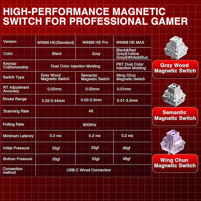 - Hall Effect Keyboard with Magnetic Switch: Equipped with advanced hall effect magnetic switches, the WIN68 HE MAX gaming keyboard offers adjustable actuation point(0.01mm-3.3mm), and each key can be personalized to the smallest unit of 0.1 mm, providing an ultra-precise keying experience. In addition, press/reset sensitivity can be individually set via software to match the keystroke habits of different people in different types of games