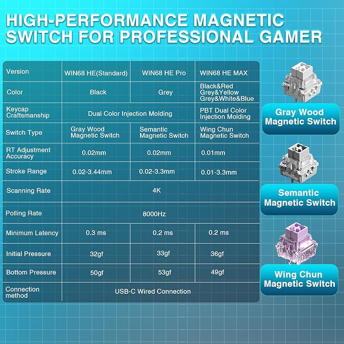 - Hall Effect Keyboard with Magnetic Switch: Equipped with advanced hall effect magnetic switches, the WIN68 HE MAX gaming keyboard offers adjustable actuation point(0.01mm-3.3mm), and each key can be personalized to the smallest unit of 0.1 mm, providing an ultra-precise keying experience. In addition, press/reset sensitivity can be individually set via software to match the keystroke habits of different people in different types of games