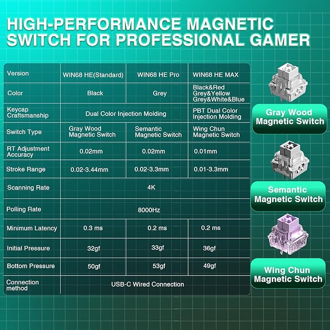 - Hall Effect Keyboard with Magnetic Switch: Equipped with advanced hall effect magnetic switches, the WIN68 HE MAX gaming keyboard offers adjustable actuation point(0.01mm-3.3mm), and each key can be personalized to the smallest unit of 0.1 mm, providing an ultra-precise keying experience. In addition, press/reset sensitivity can be individually set via software to match the keystroke habits of different people in different types of games