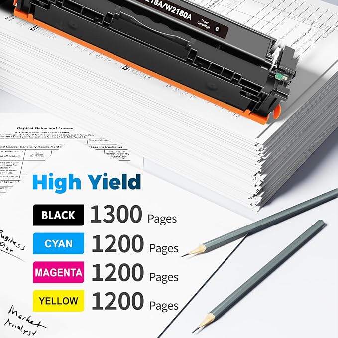 - High Page Yield: Up to 1,300 Pages for W2180A 218A Black toner cartridge, Up to 1,200 Pages for W2181A W2182A W2183A 218A Color toner cartridges at 5% coverage on letter/a4