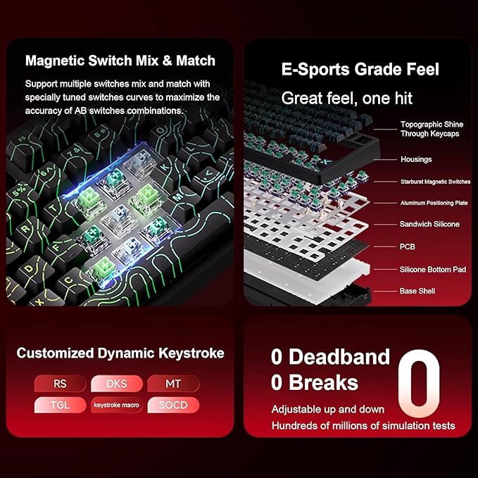 - Adjustable Magnetic-Mechanical Switches: The entire keyboard is equipped with fully adjustable high performance magnetic switches, enabling you to set every key’s actuation point from a light 0.01mm to a strong 3.4mm in 0.01mm steps, putting you in control for fast keypresses or ultra-accurate typing.