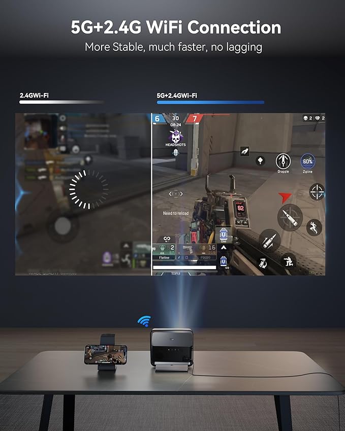 - [Latest WiFi 6 & Bluetooth 5.2] This mini projector features WiFi 6 connection for smooth video playback and lag-free gaming experience. In addition, it has Bluetooth capability, which makes it easy to connect devices such as headphones, speakers and computers. This portable projector also supports Dolby Digital audio decoding. Connect it to Dolby-enabled speakers to enjoy an immersive, cinema-quality experience that makes you feel like you're right in the movie.